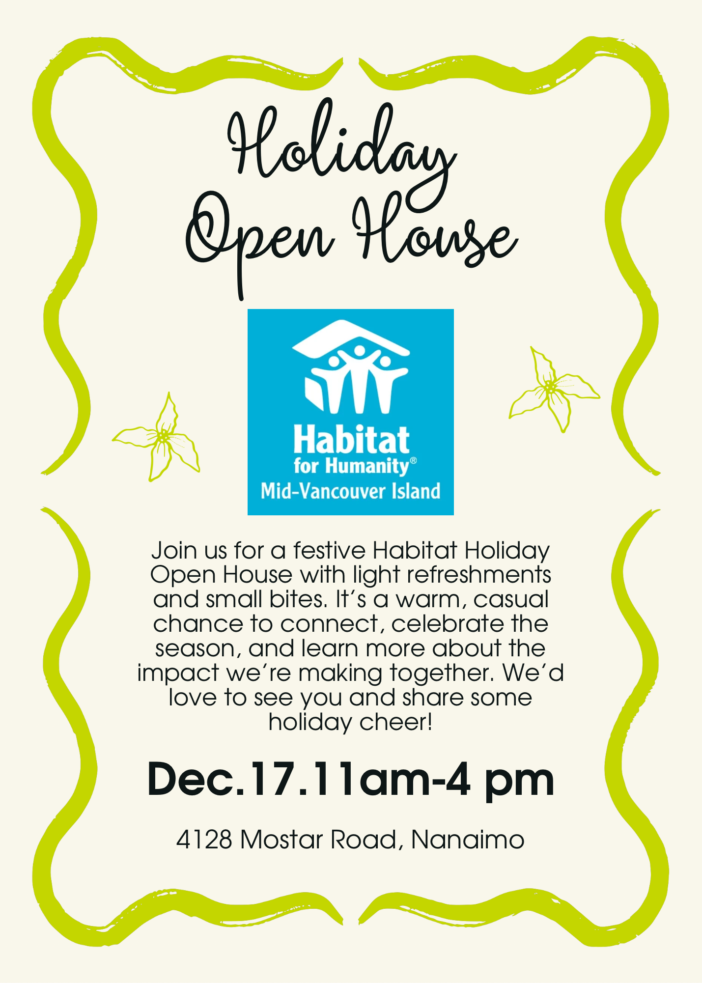 Join us for a festive Habitat Holiday Open House with light refreshments and small bites. It’s a warm, casual chance to connect, celebrate the season, and learn more about the impact we’re making together. We’d love to see you and share some holiday cheer!
